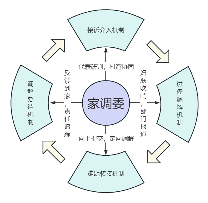 家调委合理划分各主体责任,促进事权相匹配,保障调解过程有效衔接,以责任联动实现主体联动。一是完善代表研判、村湾协同的接诉介入机制。村民代表识别出家庭矛盾风险后,上报至村“两委”,村“两委”与湾组代表需第一时间赶赴现场介入矛盾,控制矛盾发展势头。二是完善妇联吹哨、部门报道的过程调解机制。家调委接到家庭矛盾诉求后,由妇联按照家庭矛盾不同属性联系各成员单位,通过调查走访查清事实,分清责任,推动案件达成一致意见,消除纷争。三是完善向上提交、定向调解的难题转接机制。当有难以解决的案件时,下级调解组织将案件提交给上级家调委,由上级家调委统筹解决。当调解能够解决问题时,由妇联通过家调委召集调解人员,协调各成员单位解决家庭矛盾。当调解不能解决问题时,由妇联联系司法部门解决家庭矛盾。当法律渠道难以解决时,司法部门邀请妇联干部介入,发挥群团组织优势帮助案件解决。四是完善反馈到家、责任追踪的调解办结机制。家庭矛盾转接到入驻部门后,家调委督促入驻单位或协调有关部门办理,该部门办结后需向家调委反馈。另外,案件办结后,家调委将开展定期回访,确保调解有效解决家庭矛盾。例如在未成年人保护工作上,麻城市妇联对重点关注儿童情况开展调查评估,会同职能部门、乡镇(街道)、社工站及学校开展为期不少于三个月每月不少于两次的学业、心理、社交、成长辅助等方面的跟踪服务。